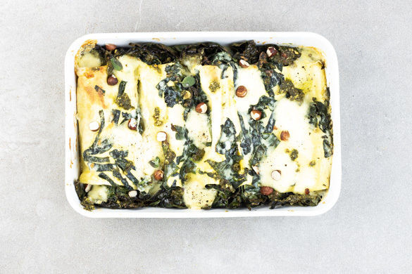 Mit frischen Lasagneblättern sind die Cannelloni ruckzuck vorbereitet und müssen nur noch im Ofen backen. Die Nudelrollen sind mit einer fein-würzigen Béchamel-Schwarzkohl-Mischung gefüllt und bekommen als Topping ein Pesto aus frischen Kräutern und Haselnuss, als Beilage gibt es noch einen erfrischend herben Radicchiosalat.