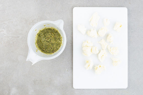 Die Basilikum- und die Oreganoblätter abzupfen. Jeweils 2–3 Blätter für die Garnitur beiseitelegen, die restlichen Kräuter in einem hohen Gefäß mit 2EL Olivenöl, 2EL Wasser und 2/3 der Nüsse zu einem cremigen Pesto pürieren. Den Mozzarella mit den Fingern in ca. 2cm große Stücke zupfen.
