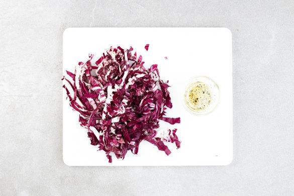 Den Radicchio von den äußeren Blättern befreien, den harten Struck entfernen und den Radicchio in feine Streifen schneiden. Aus 1EL Olivenöl, 2EL Essig, je 1/2TL Salz, Pfeffer und Zucker ein Dressing anrühren und mit dem Radicchio vermengen. Die Cannelloni mit dem restlichen Pesto und den restlichen Nüssen garnieren und mit dem Salat servieren.