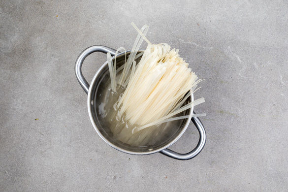 Die Limettenschale abreiben und die Limetten halbieren, zwei Hälften auspressen, die anderen Hälften in Spalten schneiden. Den Ingwer schälen und sehr fein würfeln oder reiben. In einem großen Topf ausreichend gesalzenes Wasser für die Nudeln zum Kochen bringen.