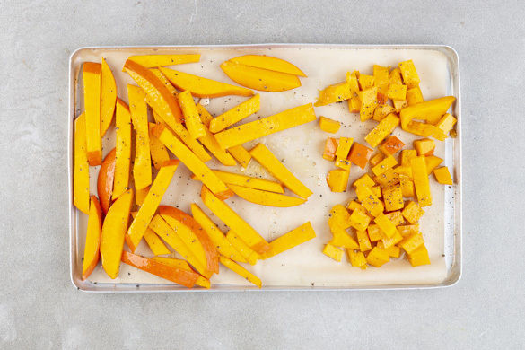 Den Backofen auf 200°C Umluft (220°C Ober-/Unterhitze) vorheizen. Den Kürbis halbieren und entkernen. Ca. 2/3 des Kürbisses in pommesartige Stifte schneiden, den restlichen Kürbis in ca. 1cm große Würfel schneiden. Den Kürbis mit Salz und Pfeffer sowie 1EL Olivenöl vermengen und auf einem mit Backpapier belegten Backblech 12–15Min. im Ofen rösten.
