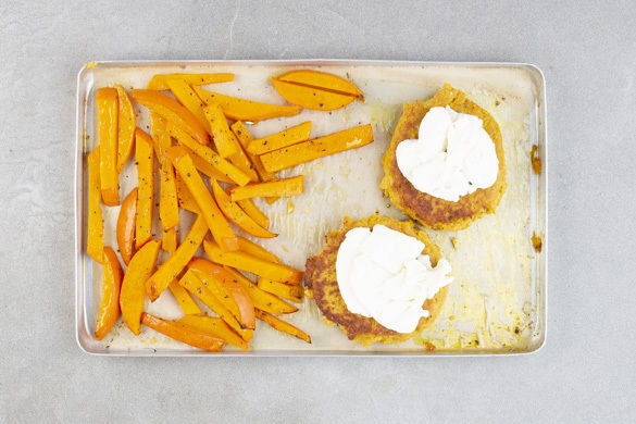 Die Pattys zu den Kürbispommes auf das Blech geben, mit dem Mozzarella belegen und 10Min. im Ofen überbacken, bis der Käse geschmolzen ist. Die Burgerbrötchen aufschneiden und während der letzten 2–3Min. dazugeben und aufwärmen.