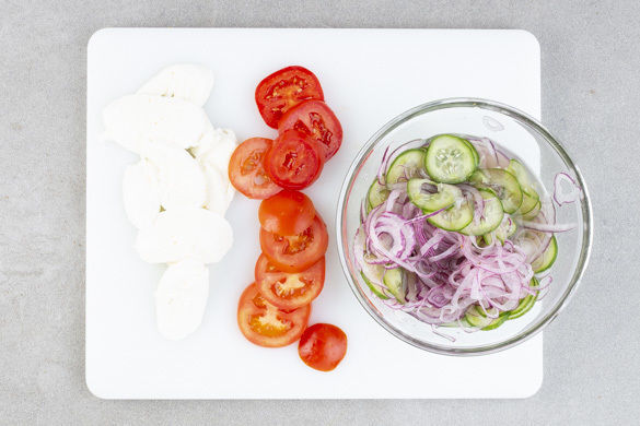 Die Zwiebel schälen und in feine Ringe schneiden. Die Gurke in sehr dünne Scheiben schneiden. Die Zwiebeln und die Gurken mit 2EL heißem Wasser, 1EL Essig und je 1/2TL Salz und Zucker vermengen und ziehen lassen. Den Mozzarella in ca. 0,5cm dünne Scheiben schneiden. Die Tomate ebenfalls in ca. 0,5cm dünne Scheiben schneiden.