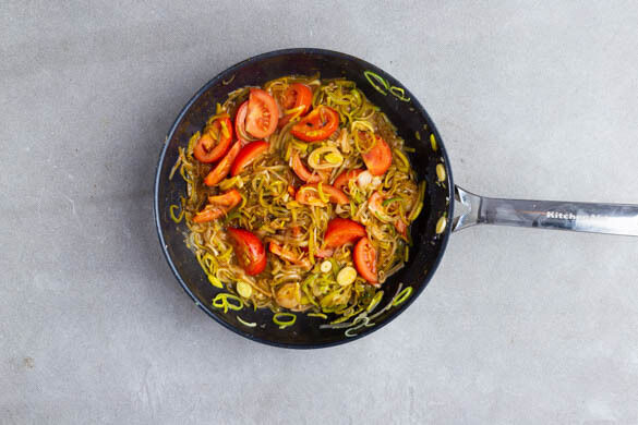 Die Tomaten in ca. 1cm breite Spalten schneiden. Den Lauch mit 1EL Essig ablöschen, dann die Tomaten und die Ingwer-Würzsauce hinzufügen und bei mittlerer bis starker Hitze ca. 3Min. mitbraten, bis die Tomaten weich sind.