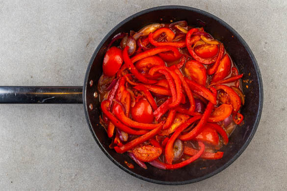 Die Chorizo aus der Pfanne nehmen. Das Gemüse und die Gewürzmischung in der Pfanne mit 2EL Olivenöl bei mittlerer Hitze unter regelmäßigem Wenden ca. 5Min. braten, bis die Zwiebeln weich und glänzend sind.