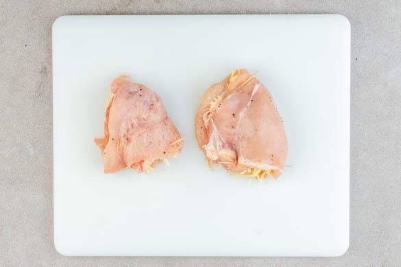 Das Fleisch trocken tupfen, horizontal halbieren und zwischen zwei Lagen Frischhaltefolie oder Backpapier mit einem Fleischklopfer oder dem Boden einer schweren Pfanne ca. 0,5cm dünn klopfen. Von beiden Seiten mit je 1 Prise Salz und Pfeffer würzen. Das Fleisch einseitig mit 1EL Käse und 1–2 Scheiben Schinken belegen, zusammenklappen und mit einem Zahnstocher verschließen.