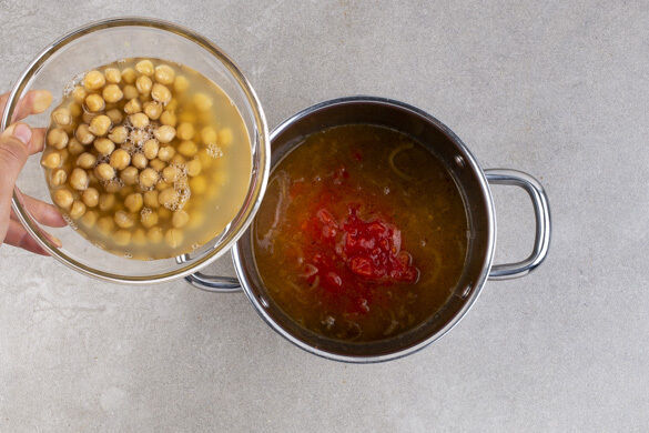 Das Hackfleisch mit dem gekochten Wasser ablöschen, dann das Brühgewürz, die gehackten Tomaten sowie die Kichererbsen samt Flüssigkeit zugeben und die Suppe ca. 5Min. sanft köcheln lassen.