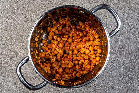 Die Kichererbsen in einem Sieb mit kaltem Wasser abspülen, abtropfen lassen und mit etwas Küchenkrepp möglichst trocken tupfen. Die Kichererbsen in den Topf zu der Sauce geben, dann ca. die ½ der Kichererbsen mit einem Kartoffelstampfer grob zerdrücken.