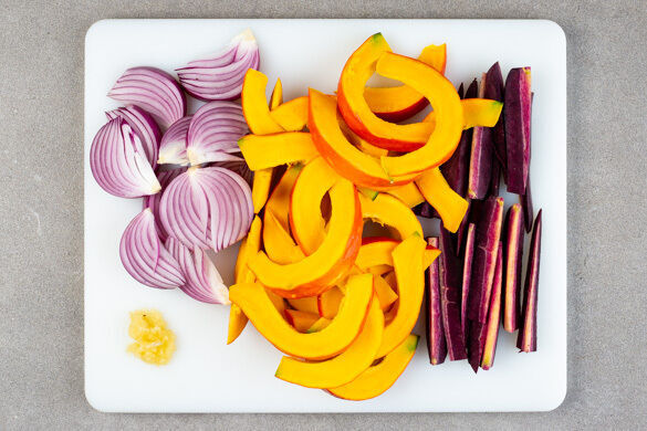 Den Backofen auf 200°C (180°C Umluft) vorheizen. In einem kleinen Topf 400ml Wasser für die Quinoa zum Kochen bringen.Den Kürbis halbieren, entkernen und in ca. 1cm breite Spalten schneiden. Die Karotte ggf. schälen und der Länge nach in dünne Stifte schneiden. Die Zwiebel schälen, halbieren und in feine Streifen schneiden. Den Knoblauch schälen und fein reiben.