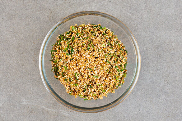 Ca. ⅔ der Kräuter unter die Quinoa rühren, dann mit der restlichen Zitronenschale sowie Salz und Pfeffer abschmecken. Die Quinoa, das Wintergemüse, die Walnüsse und die Eier auf Teller verteilen. Mit etwas Tahinisauce und Sambaldip beträufeln und mit den restlichen Kräutern garnieren. Die restliche Sauce und den restlichen Dip dazu reichen.