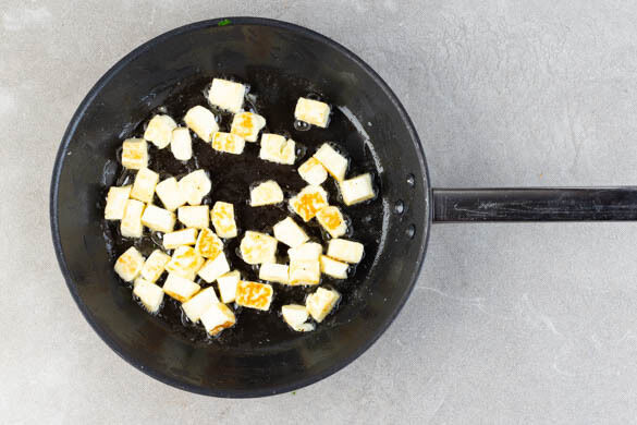 Den Rosenkohl aus der Pfanne nehmen und beiseitestellen. Den Grillkäse in derselben Pfanne bei mittlerer Hitze ca. 4Min. von allen Seiten goldbraun anbraten.