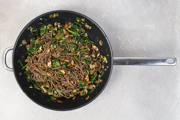 Von süß bis scharf ist heute alles dabei! Dieses einfach zubereitete Gericht dauert von Anfang bis Ende nur rund 20 Minuten. Die fleischigen Pilze und der gebratene Spinat nehmen alle Aromen der süß-würzigen Sauce nur zu gern auf und sorgen so für geschmackliche Fülle. Die Sobanudeln sind die perfekte Basis. Lasst es euch schmecken!