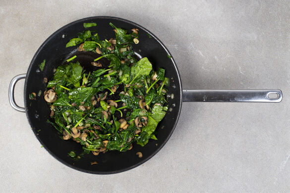 Den Spinat zu den Pilzen in die Pfanne geben und abgedeckt bei mittlerer Hitze ca. 1Min. garen, bis er zusammenfällt.