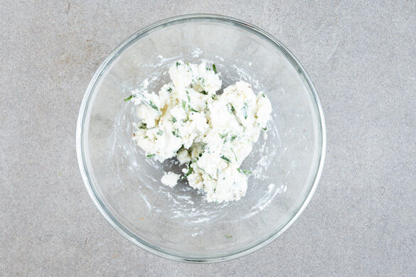 Den Ziegenfrischkäse mit dem Knoblauch, ca. ¾ des Estragons und 1 kräftigen Prise Pfeffer verrühren.