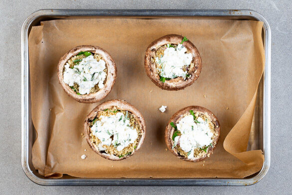 Die Stiele der Pilze entfernen und die Pilze jeweils mit ½TL Olivenöl einreiben und mit je 1 Prise Salz und Pfeffer würzen. Jeden Pilz mit 2–3EL Couscous füllen und die Käsecreme darauf verteilen. Die gefüllten Pilze auf ein mit Backpapier ausgelegtes Backblech geben und 15–20Min. im Ofen backen, bis die Pilze gar sind und die Käsecreme goldbraun ist.