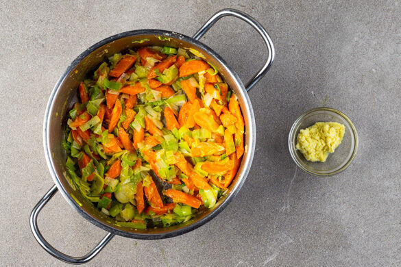 Den Lauch und die Karotten in einem großen Topf mit 2EL Pflanzenöl, 1TL Mehl und 1 kräftigen Prise Salz 4–5Min. bei mittlerer Hitze anbraten, bis das Gemüse weich wird. Das Gemüse aus dem Topf nehmen und auf einem Teller beiseitestellen.
