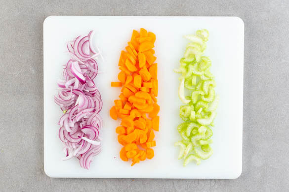 Ca. ¾ der Zwiebeln, die Karotten und den Sellerie in einem großen Topf mit 2EL Olivenöl bei mittlerer Hitze in 7–8Min. weich braten.