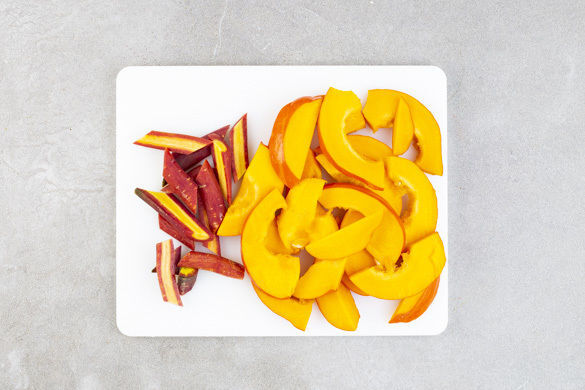 Den Backofen auf 190°C (170°C Umluft) vorheizen. Den Kürbis halbieren, entkernen und in ca. 1cm breite Spalten schneiden. Die Karotten ggf. schälen, quer halbieren und je nach Dicke längs vierteln oder sechsteln.