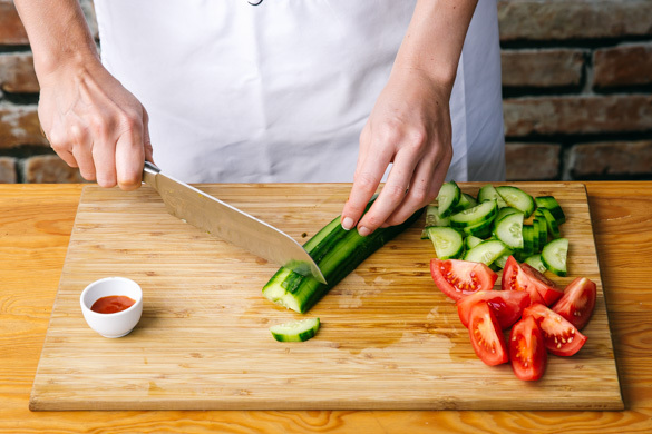 Die Tomaten in Spalten schneiden, dabei den Strunk entfernen. Die Gurke ggf. schälen, längs vierteln und in ca. 0,5cm dünne Scheiben schneiden. Die Tomaten und die Gurken mit der Sriracha-Sauce vermengen.