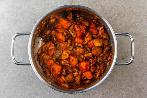 Die Gewürzmischung in den Topf geben und in ca. 30Sek. duftend anbraten. 1EL Essig und das Tomatenmark hinzugeben und unter gelegentlichem Rühren ca. 2Min. braten, bis der Essig verdampft und das Tomatenmark dunkelrot ist.