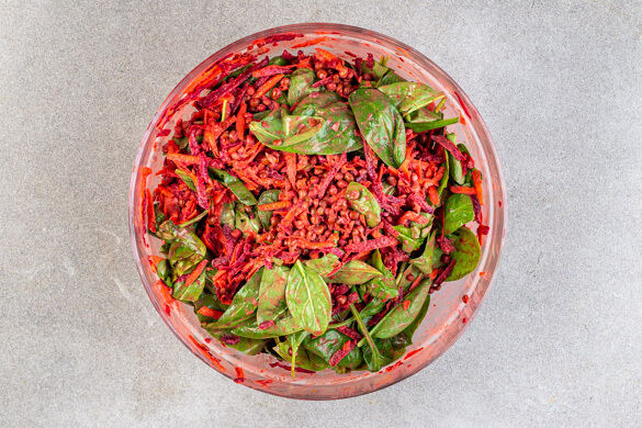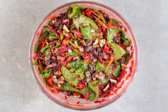 Diese überaus fix gemachte Bowl strotzt nur so vor Geschmack und Farben! Leckere Linsen, Kidneybohnen aus dem Ofen, frischer Spinat, geriebene Karotte, Rote Bete und knackige Pekannüsse suhlen sich in einem Dressing der besonderen Art: Tahini, Knoblauch, Hefeflocken und Sojasauce ergeben ein Geschmackserlebnis, das du so schnell nicht vergessen wirst! Einfach perfekt!