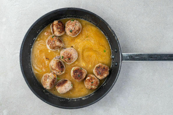 2EL Mehl in die Pfanne geben und gut mit dem Bratensatz verrühren. Dann 2EL Ketchup und das Brühgewürz dazugeben, die Hackbällchen samt ausgetretenem Bratensaft in die Pfanne legen und ca. 600ml Wasser angießen. Die Sauce 3–4Min. bei mittlerer Hitze sanft köcheln lassen.