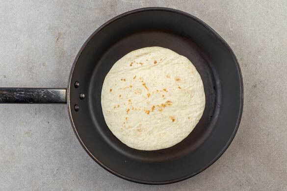 Inzwischen 4 Tortillas nacheinander in einer zweiten mittelgroßen Pfanne bei mittlerer Hitze auf jeder Seite 15–30Sek. erwärmen.