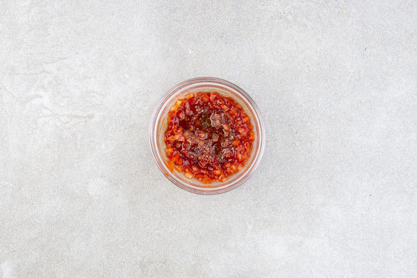 Den Ketchup mit den Tomatenwürfeln und einigen Tropfen Trüffelöl verrühren. Mit Salz und Pfeffer sowie ggf. mehr Trüffelöl abschmecken.