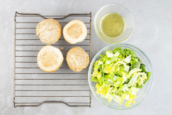 Den Salat in ca. 1cm dünne Streifen schneiden, den Strunk entfernen. Für das Dressing jeweils 2–3EL Olivenöl, Essig und Wasser oder Fruchtsaft verrühren und das Dressing mit Salz und Pfeffer sowie 1 Prise Zucker abschmecken. Die Burgerbrötchen aufschneiden und 3–4Min. im Ofen aufbacken.