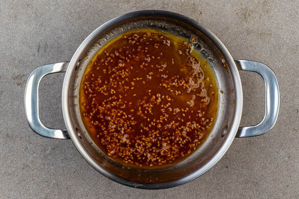 In einem mittelgroßen Topf 1EL Butter bei mittlerer Hitze schmelzen. Den restlichen Sesam, den Ahornsirup und 1 kräftige Prise Salz zugeben und unter ständigem Rühren ca. 2Min. sanft köcheln lassen, bis ein zähflüssiger Karamell entsteht. Vom Herd nehmen und beiseitestellen.