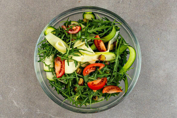 Italienische Küche vom Feinsten gibt es heute mit diesem köstlichen Salat zum Sattessen! Die raffinierte Komposition aus breiten Zucchinistreifen, knusprigen Kichererbsen, fruchtiger Tomate und einem aromenstarken Pesto aus Pinienkernen, Käse, Basilikum und getrockneten Tomaten ist große Klasse. Gekrönt wird sie von lecker-cremigem Mozzarella. Buon appetito!