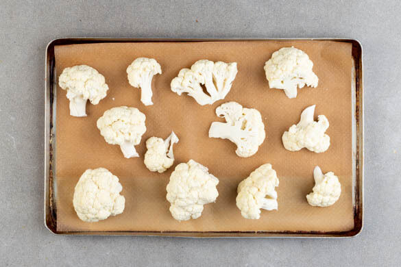 Den Backofen mit Grillfunktion oder Ober-/Unterhitze auf 250°C. Den Blumenkohl in große Röschen zerteilen und auf ein mit Backpapier ausgelegtes Blech geben. Ggf. die zarten inneren Blätter des Blumenkohls beiseitelegen.