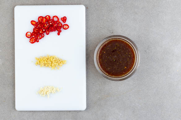 Die Limettenschale abreiben, dann die Limette halbieren und auspressen. Den Limettensaft und die Sojasauce mit der Limettenschale, 1TL Zucker und 1EL Mehl verrühren, dann 90ml kaltes Wasser nach und nach einrühren, damit sich keine Klumpen bilden.