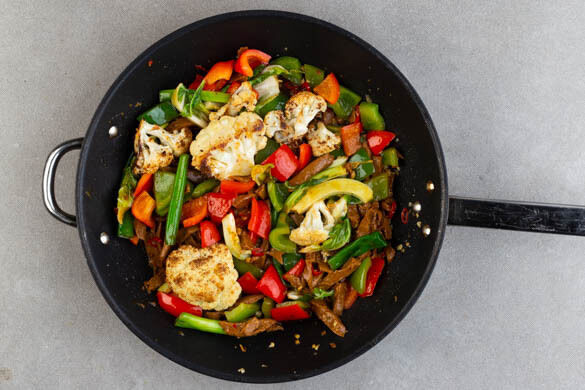 Wir lieben Wokgerichte besonders dafür, dass sie so einfach sind. Sie nehmen jede Zutat mit offenen Armen auf und was am Ende dabei herauskommt, ist eine wärmende Mischung voller Geschmack. Heute in unserem Wok: Paprika, Lauchzwiebeln und vegane Rindfleischstreifen, die mit Knoblauch, Ingwer und Chili aromatisiert werden. Dazu gesellen sich ofengerösteter Blumenkohl und eine Soja-Limetten-Sauce. Mmmh!
