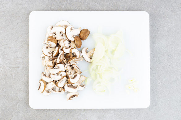 Den Backofen auf 220°C (200°C Umluft) vorheizen. In einem mittelgroßen Topf 600ml leicht gesalzenes Wasser für den Reis zum Kochen bringen. Die Pilze ggf. säubern und in dünne Scheiben schneiden. Die Zwiebel schälen, halbieren und in feine Streifen schneiden. Den Knoblauch schälen und in feine Scheibchen schneiden.