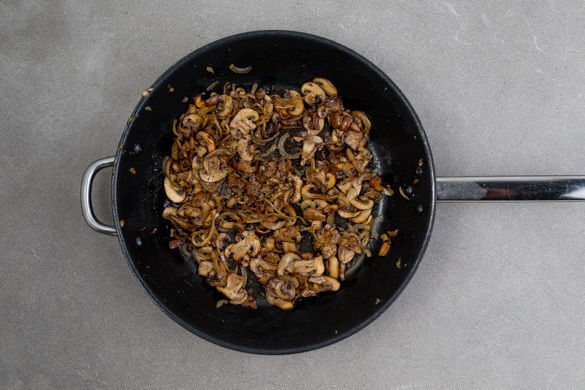 Die Zwiebeln in einer großen Pfanne mit 2EL Olivenöl und 1 kräftigen Prise Salz bei mittlerer Hitze 2–3Min. anbraten. Die Pilze und den Knoblauch dazugeben und weitere 5–8Min. braten, bis die austretende Flüssigkeit verdampft ist.