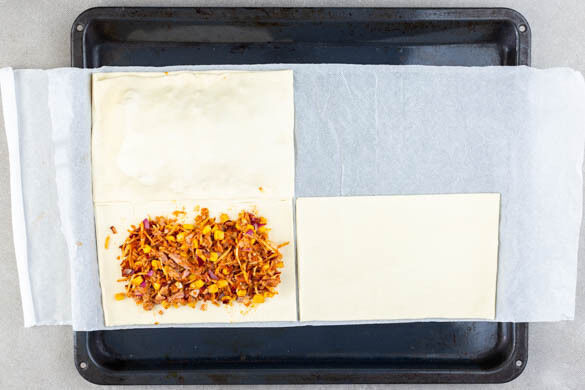 Die Teige mit dem Papier nach unten auf zwei Backblechen ausrollen und in je 4 Rechtecke schneiden. Die Füllung auf jedem Blech auf der ½ der Teigrechtecke verteilen, dabei einen schmalen Rand frei lassen. Mit den restlichen Teigrechtecken abdecken und die Ränder leicht zusammendrücken.