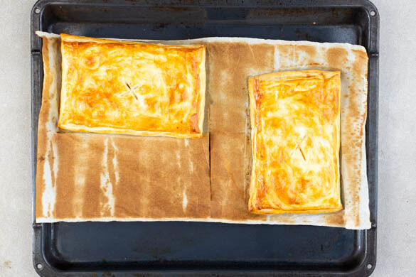 Die Blätterteigtaschen an der Oberfläche kreuzförmig einschneiden. Mit dem verquirlten Ei gleichmäßig bepinseln und 13–15Min. im Ofen backen, bis der Teig goldbraun und an den Rändern leicht knusprig ist. Je nach Ofen die Position der Bleche nach der Hälfte der Zeit tauschen.
