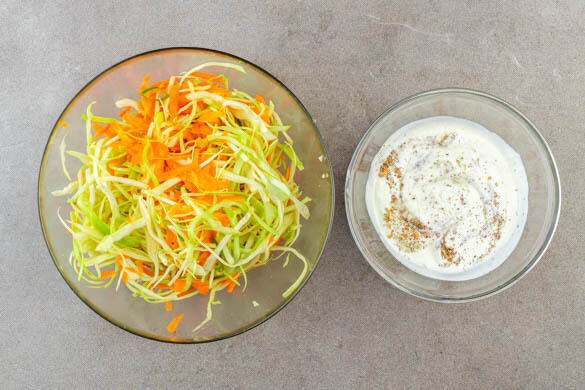Die Lauchzwiebeln in dünne Ringe schneiden. Die ½ des übrigen Knoblauchs, 2EL Olivenöl, 2EL Essig, 1EL Senf, 1TL Zucker, 1TL Salz und etwas Pfeffer zu einem Dressing verrühren und mit dem Weißkohl, den Karotten und den Lauchzwiebeln vermengen. Den Joghurt mit dem übrigen Knoblauch und der restlichen Gewürzmischung verrühren und mit Salz und Pfeffer abschmecken.