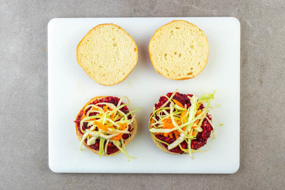 Die Brötchen im Ofen 3–5Min. aufbacken. Dann aufschneiden und die Schnittseiten mit etwas Joghurt bestreichen. Mit etwas Salat und je 1 Patty pro Brötchen belegen. Die Burger mit den Karottenpommes servieren. Die übrigen Pattys, den Joghurt und den restlichen Salat für das zweite Gericht im Kühlschrank aufbewahren.