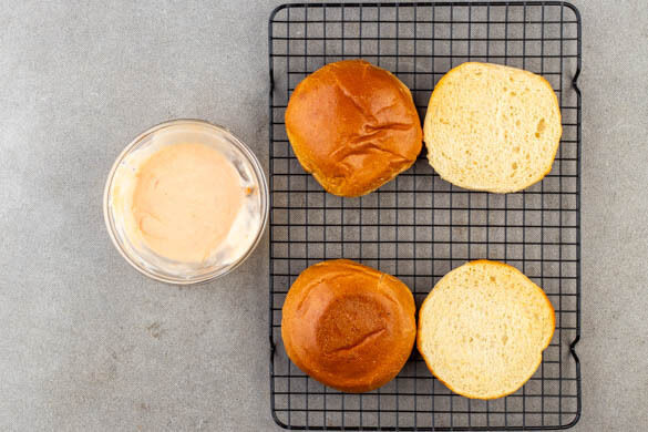 4EL Mayonnaise mit 2EL Kimchiflüssigkeit, 1EL Ketchup und 1EL Essig zu einer Sauce verrühren und mit Salz und Pfeffer abschmecken. Die Brötchen aufschneiden und 2–3Min. im Ofen aufbacken.