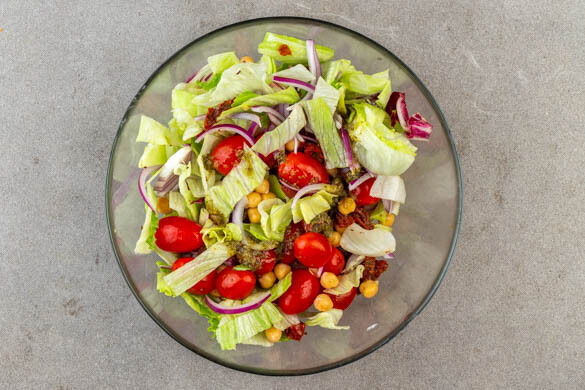Die Zwiebeln in einem Sieb abtropfen lassen, dann mit dem Salat, den Kichererbsen, den getrockneten Tomaten, den Oliven, den Kirschtomaten und dem Dressing vermengen.