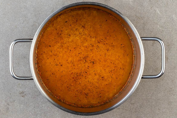 Für die Pasta in einem mittelgroßen Topf 400ml Wasser mit dem Brühgewürz und der Gewürzmischung zum Kochen bringen. Die Pasta in die kochende Brühe geben, gut umrühren und abgedeckt in 10–12Min. bissfest kochen. Zwischendurch prüfen und nach Bedarf ggf. etwas mehr heißes Wasser hinzugeben.