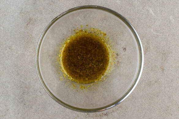 Die Basilikumcreme mit ½TL Zitronenschale, der ½ des Zitronensafts, 2EL Olivenöl und je 1 Prise Salz und Pfeffer zu einem Dressing verrühren. Abschmecken und ggf. mehr Zitronensaft, Salz und Pfeffer zugeben.