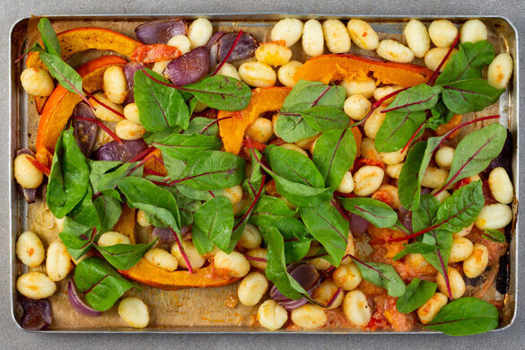 Die Gnocchi portionsweise mit einer Schaumkelle aus dem Wasser heben, abtropfen lassen und direkt zum Gemüse auf das Blech geben. Den Mangold dazugeben und alles gut vermengen, dann die Gnocchi und das Gemüse auf Tellern anrichten. Nach Belieben mit dem Pistou garnieren und servieren.