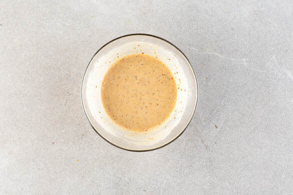 Das Chutney mit 4EL veganer Mayonnaise, 3EL körnigem Senf, 3–4EL Essig, 6–8EL Wasser und 1–2 Prisen Salz zu einem cremigen Dressing verrühren. Tipp: Wer keinen körnigen Senf hat, kann auch normalen Senf verwenden.