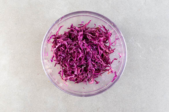 Den Rotkohl in feine Streifen scneiden, mit 1 kräftigen Prise Salz vermengen und mit den Händen ca. 1Min. weich kneten. Die ½ des Dressings untermischen.