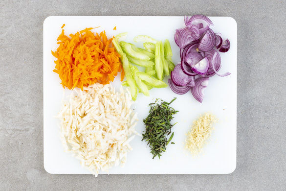 Den Knollensellerie und ggf. die Karotte schälen und mit einer Küchenreibe grob raspeln. Den Stangensellerie schräg in möglichst feine Scheiben schneiden. Die Zwiebel schälen, halbieren und in feine Streifen schneiden. Den Meerrettich schälen und fein reiben. Die Estragonblätter von den Stängeln zupfen und grob schneiden.