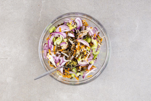 Die Linsen mit dem Stangensellerie und den Zwiebeln vermengen. Die Zitronenschale abreiben und die Zitrone halbieren, eine Hälfte auspressen, die andere Hälfte in Spalten schneiden. Den Linsensalat mit 2EL Olivenöl, Zitronensaft nach Geschmack, 1TL Zitronenschale sowie Salz und Pfeffer abschmecken.