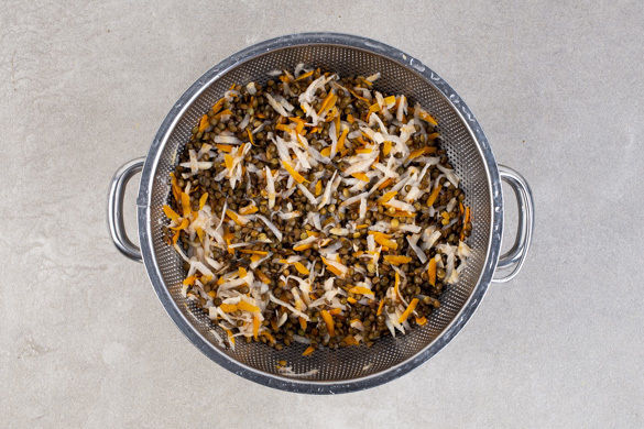 Die Knollensellerie- und die Karottenraspel während der letzten 3Min. zu den Linsen geben und mitköcheln lassen, bis das Gemüse bissfest ist. Anschließend alles in ein Sieb abgießen und abtropfen lassen.